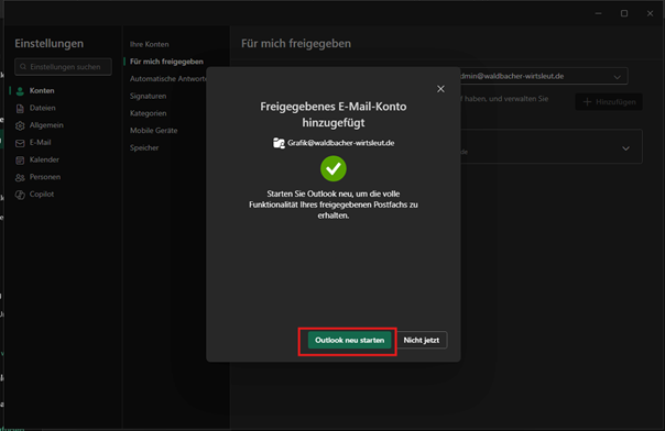 Das Freigegeben Postfach wurde hinzugefügt.