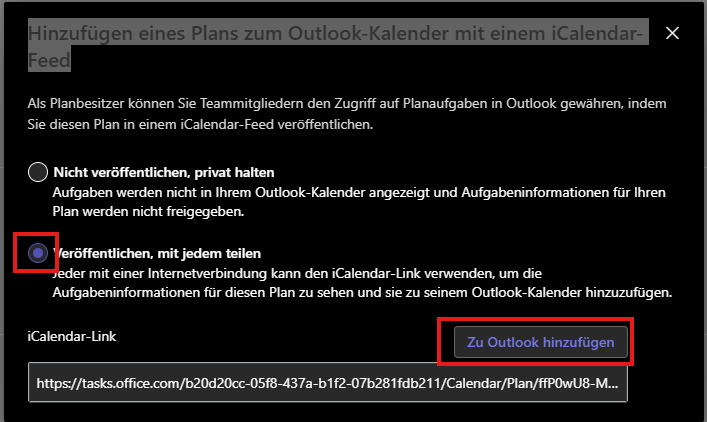 Klicke auf Veröffentlichen, mit jedem teilen und dann auf Zu Outlook hinzufügen